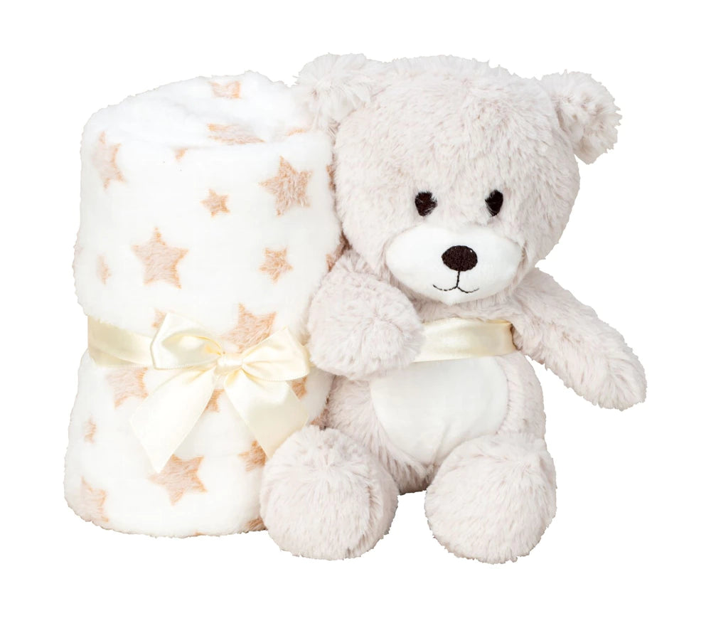 Ein mjúk og yndig bamsa (h 20cm), líka til at klemma. Flis teppi (90 x 75 cm) fylgir við.